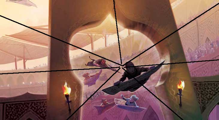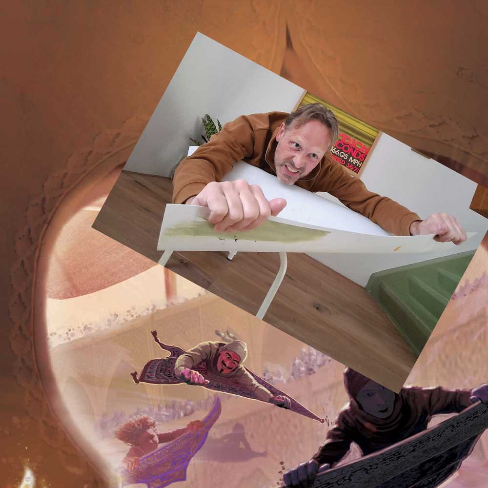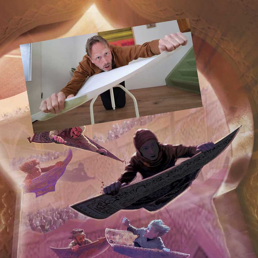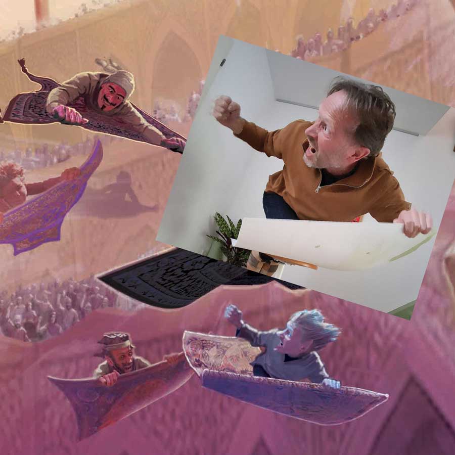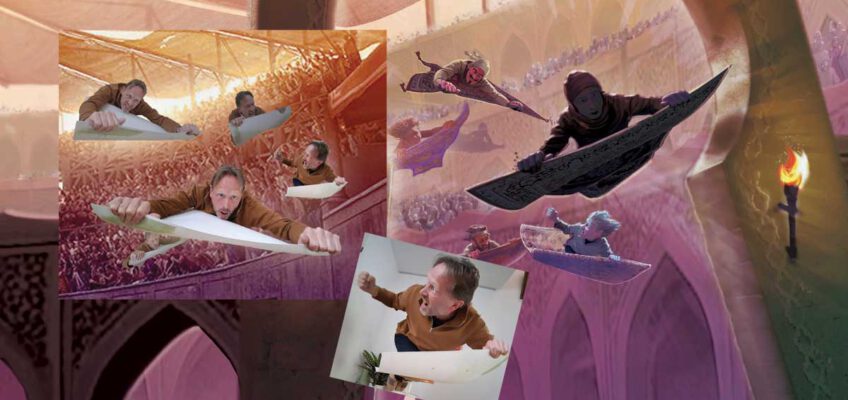Voorbeeld van de cover van mijn nieuwe boek. Ik wilde een dynamisch beeld. Het vliegende tapijt komt bijna de afbeelding uit. Dat is wat je met perspectief kan doen.