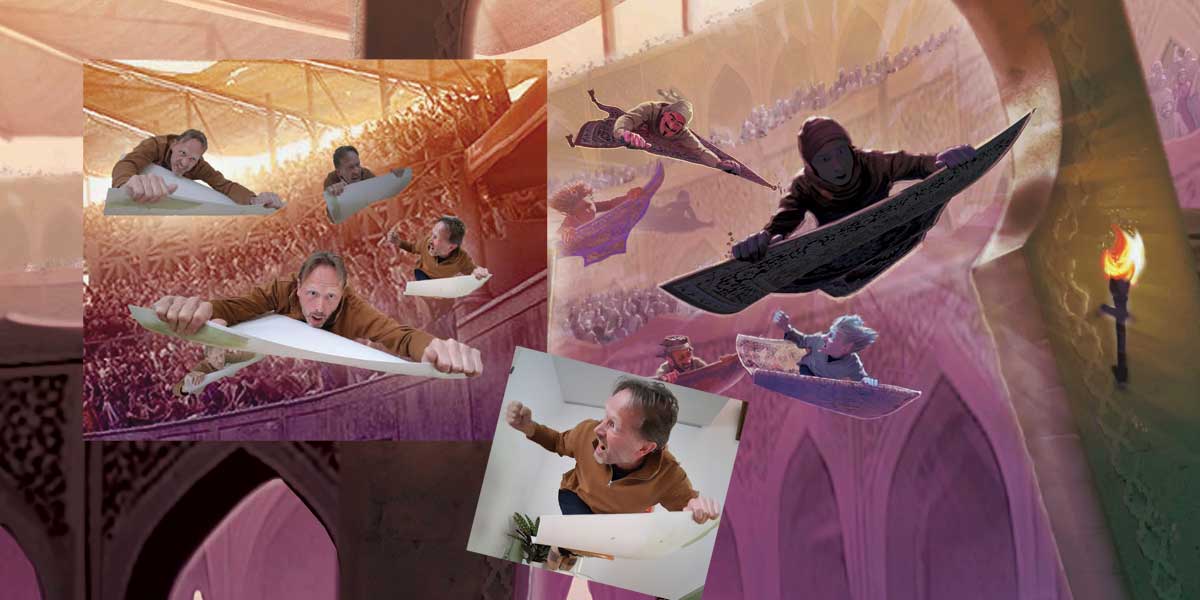 Voorbeeld van de cover van mijn nieuwe boek. Ik wilde een dynamisch beeld. Het vliegende tapijt komt bijna de afbeelding uit. Dat is wat je met perspectief kan doen.